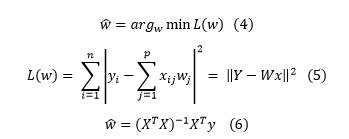 Ordinary least squares is method for estimating the unknown variables in a linear regression process (in our case the variable w). It is based on the principle of minimizing the squared errors of the differences between the actual and predicted values (equation (4)). The problem is a quadratic optimization process which is convex and always has a solution. The mathematical notation is as given by equation (5) in scalar and matrix form and and the optimal solution is given by matrix by equation (6) in matrix form.