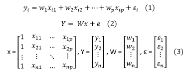 Assuming we have the following dataset: {yi,xi1,…,xip} where i is the number of the examples available and p is the number of predictors, then the equation describing the relationship of y with multiple predictors x is shown in equation (1) in the following image. Equation (2) shows equation (1) in matrix notation and equations (3) highlight the matrices used in equation (2).