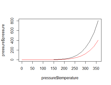 plot(pressure$temperature, pressure$pressure, type = "l") lines(pressure$temperature, pressure$pressure/2, col="red")