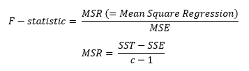 The F-statistic highlights the overall significance of the model and it assess whether at least one predictor variable has a non-zero value. The formula for thsi metric is the folowing;